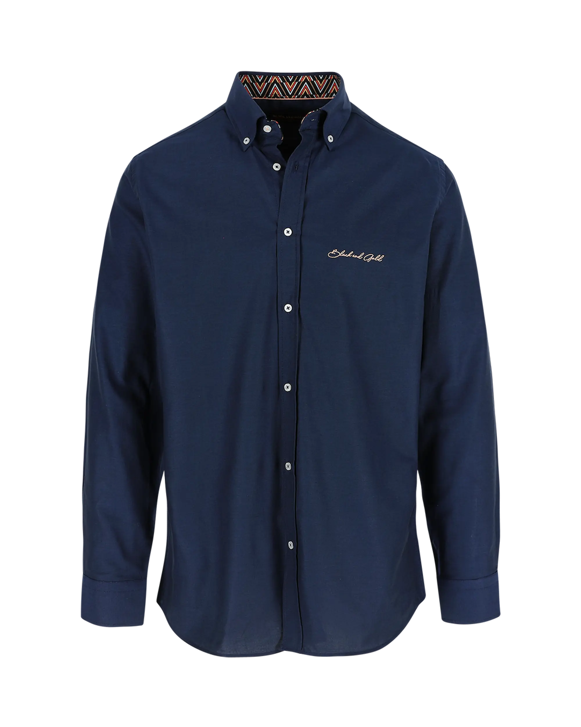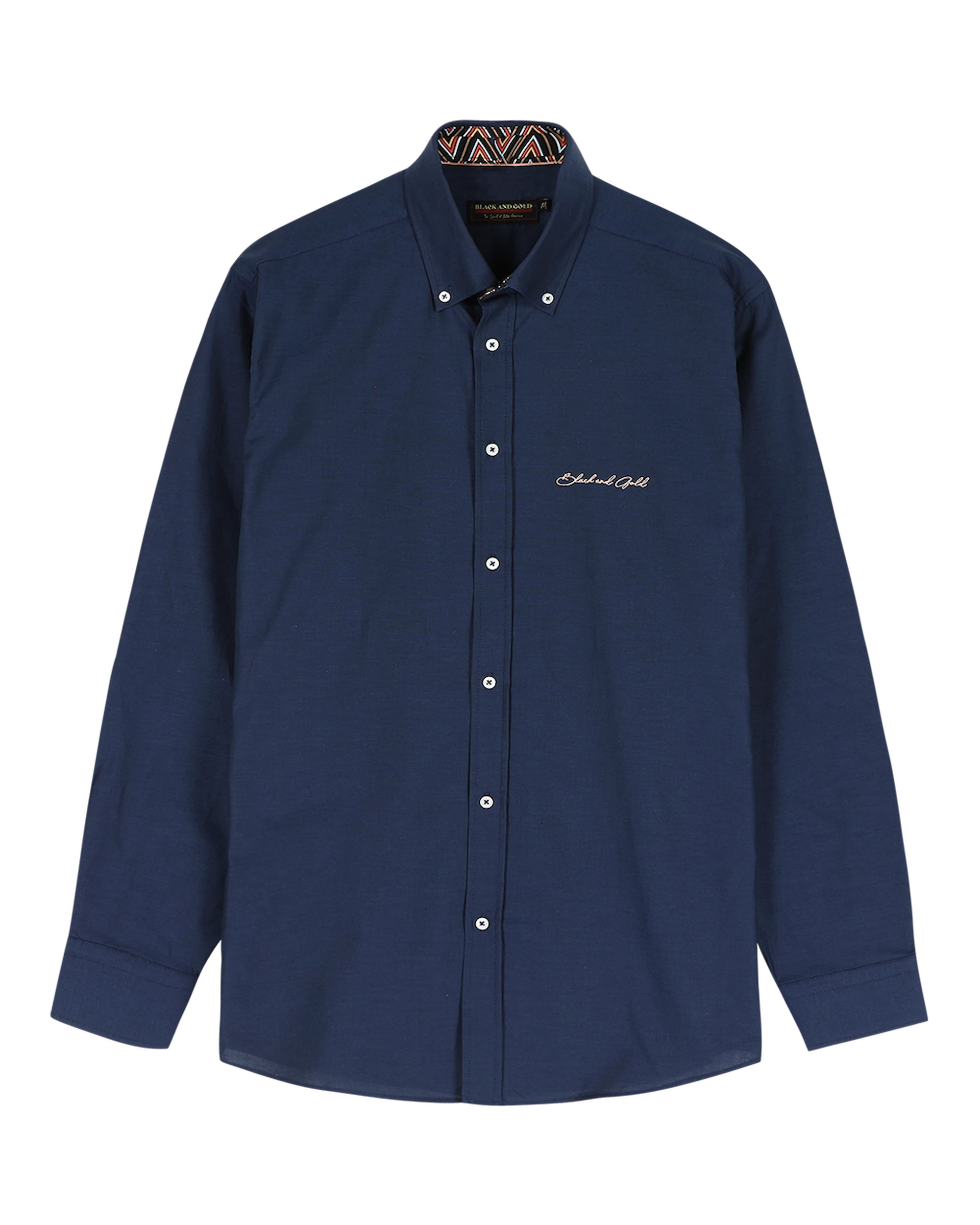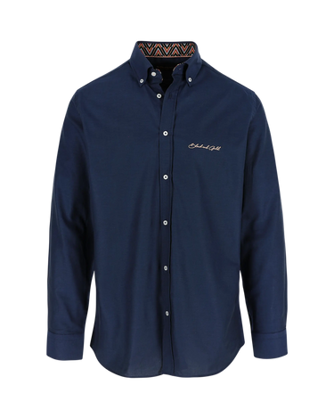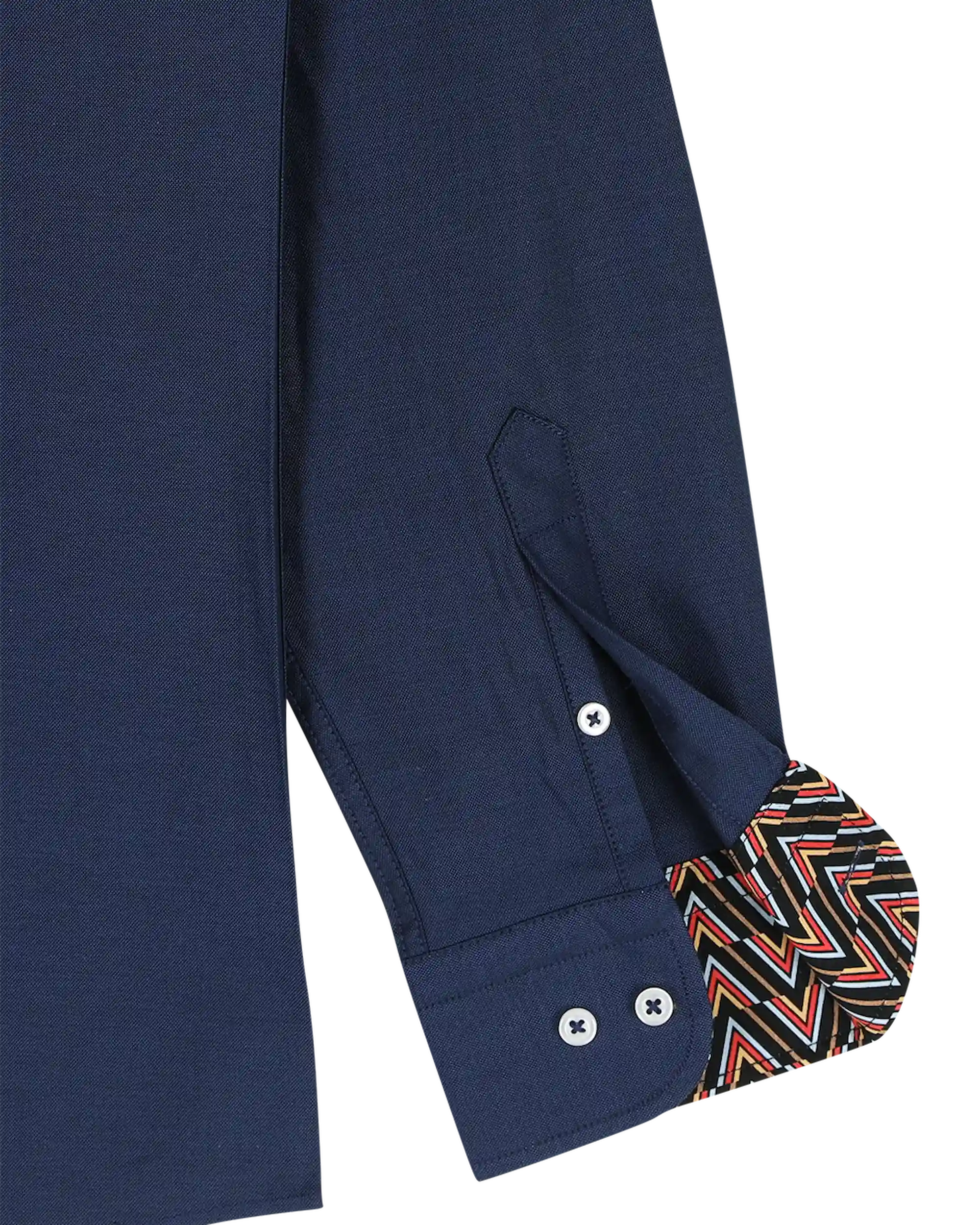 Het donkerblauwe hemd biedt veelzijdige styling mogelijkheden, terwijl onze karakteristieke geometrische afwerking een verfijnde edge toevoegt aan dit garderobe-essentieel. Het opvallende chevron patroon, met onze kenmerkende zwart-goud kleurstelling en gedurfde rode accenten, onthult zich subtiel bij de manchetten en kraag – een perfecte mix van verfijning en stijl.